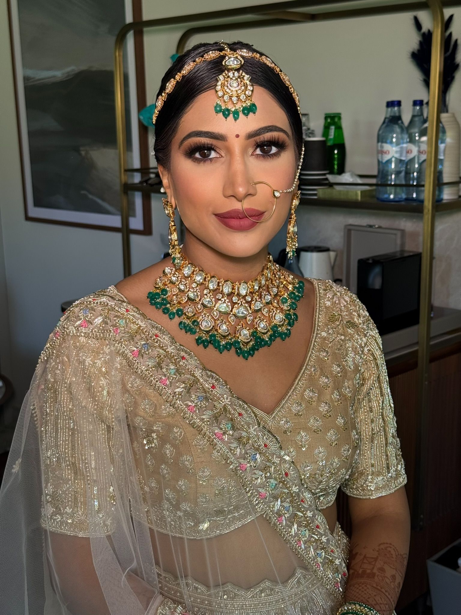 - Asian bridal jewellery setting — tikka, passa, earrings, necklace, jhumar placement